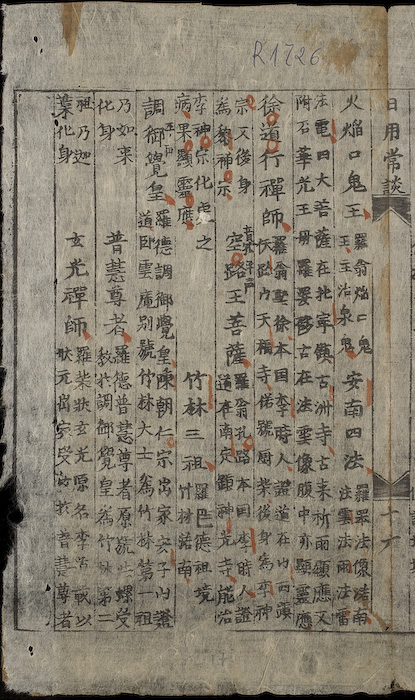 | Hán-Việt reading : Không Lộ Vương Bồ Tát Hán text : 空路王菩薩 Nôm text : 羅翁孔路本囯李時人證道在南定鎮神光寺能治李神宗化虎之病果顯靈應 Quốc Ngữ : là ông Khổng Lộ (bản quốc, Lí thời nhân, chứng đạo tại Nam Định trấn. Thần Quang tự, năng trị Lí Thần Tông hoá hổ chi bệnh, quả hiển linh ứng = người thời Lí nước ta, đắc đạp ở trấn Nam Định. Niên hiệu Thân Quang đã trị khỏi bệnh Lí Thần Tông hoá hổ, quả nhiên rất linh ứng) English : Khổng Lộ sage (living in Lý dynasty, reaching supreme perfect bodhi in Nam Dinh province. Name of reign’s years is Thân Quang who helped Lí Thần Tông to recover from an illness, it is very magical Column : 4 | ![]() |