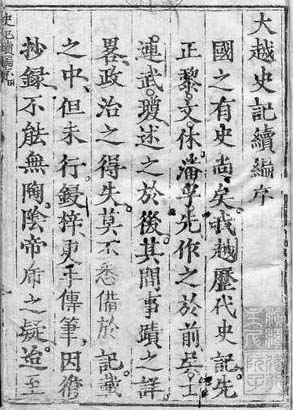 大 越 史 記 續 編 序 [1a*1*1] Đại Việt sử kí tục biên tự. 國 之 有 史 尙 矣 [1a*2*1] Quốc chi hữu sử thượng hĩ. 我 越 歷 代 史 記 先 正 黎 文 休 潘 孚 先 作 之 於 前 吳 士 連 武 瓊 述 之 於 後 [1a*2*7] Ngã Việt, lịch đại sử kí tiên chính Lê Văn Hưu, Phan Phu Tiên tác chi ư tiền, Ngô Sĩ Liên, Vũ Quỳnh thuật chi ư hậu. 其 間 事 蹟 之 詳 畧 政 治 之 得 失 莫 不 悉 備 於 記 载 之 中 [1a*4*8] Kì gian sự tích chi tường lược, chính trị chi đắc thất, mạc bất tất bị ư kí tải chi trung. 但 未 行 鋟 梓 更 手 傳 筆 因 循 抄 録 不 䏻 無 陶 陰 帝 乕 之 疑 [1a*6*3] Đãn vị hành tẩm tử, cánh thủ truyền bút, nhân tuần sao lục, bất năng vô đào âm đế hổ chi nghi. 迨 至 [1a*7*12] Đãi chí ...