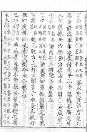丁 卯 唐 天 祐 四 年 梁 太 祖 朱 全 忠 更 名 晃 開 平 元 年 [17b*1*1] Đinh Mão, [Đường Thiên Hựu tứ niên; Lương Thái Tổ Chu Toàn Trung, cánh danh Hoảng, Khai Bình nguyên niên]. 梁 以 廣 州 節 度 使 劉 隐 兼 靜 海 軍 節 度 使 封 南 平 王 [17b*1*21] Lương dĩ Quảng Châu Tiết độ sứ Lưu Ẩn kiêm Tĩnh Hải quân Tiết độ sứ, phong Nam Bình Vương. 時 隐 據 番 禺 交 州 人 曲 顥 據 州 治 稱 節 度 使 志 在 相 圖 [17b*2*13] Thời, Ẩn cứ Phiên Ngung, Giao Châu nhân Khúc Hạo cứ châu trị, xưng Tiết Độ sứ, chí tại tương đồ. 是 歲 唐 亡 [17b*3*15] Thị tuế Đường vong. 辛 未 梁 乾 化 元 年 [17b*4*1] Tân Mùi, [Lương Càn Hoá, nguyên niên]. 梁 南 平 王 劉 隐 卒 弟 巖 立 [17b*4*8] Lương Nam Bình Vương Lưu Ẩn tốt, đệ Nham lập. 丁 丑 梁 末 帝 友 貞 更 名 瑱 貞 明 三 年 [17b*5*1] Đinh sửu, [Lương Mạt đế Hữu Trinh, cánh danh Chẩn, Trinh Minh tam niên]. 梁 廣 州 知 留 後 劉 巖 建 國 號 曰 漢 即 南 漢 紀 元 乾 亨 元 年 [17b*5*15] Lương Quảng Châu tri lưu hậu Lưu Nham kiến quốc hiệu viết Hán [tức Nam Hán], kỷ Nguyên Càn Hanh nguyên niên. 曲 顥 遣 子 承 美 為 歡 好 使 如 廣 州 因 覘 虚 實 [17b*6*13] Khúc Hạo khiển tử Thừa Mĩ vi Hoan hảo sứ như Quảng Châu nhân siêm hư thực. 顥 卒 承 美 襲 位 [17b*7*9] Hạo tốt, Thừa Mĩ tập vị. 己 卯 梁 貞 明 五 年 [17b*8*1] Kỉ Mão, [Lương Trinh Minh ngũ niên]. 曲 承 美 遣 使 求 節 鉞 於 梁 [17b*8*8] Khúc Thừa Mĩ khiển sứ cầu tiết việt ư Lương. 梁 授 之 [17b*8*19] Lương thụ chi. 漢 主 大 怒 [17b*8*22] Hán chủ đại nộ. 漢 主 初 名 岩 更 名 涉 又 名 龔 因 白 龍 見 故 名 焉 [17b*9*4] [Hán chủ sơ danh Nham, cánh danh Thiệp, hựu danh Cung, nhân bạch long hiện, cố danh yên. 至 晋 天 福 大 年 以 龔 為 不 利 乃 自 改 [17b*9*21] Chí Tấn Thiên Phúc lục niên, dĩ Cung vi bất lợi, nãi tự cải..