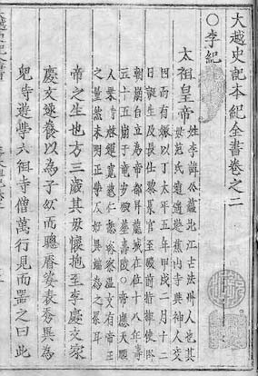 大 越 史 記 本 紀 全 書 卷 之 二 [1a*1*1] Đại Việt Sử Ký Bản Kỷ Toàn Thư Quyển Chi Nhị. 李 紀 [1a*2*1] Lí KỶ. 太 祖 皇 帝 [1a*3*1] Thái Tổ Hoàng Đế. 姓 李 諱 公 藴 北 江 古 法 州 人 也 其 母 范 氏 逍 遙 遊 焦 山 寺 與 神 人 交 因 而 有 娠 以 丁 太 平 五 年 甲 戌 二 月 十 二 日 𧩙 生 [1a*3*5] [Tính Lí, huý Công Uẩn, Bắc Giang, Cổ Pháp châu nhân dã. Kì mẫu Phạm thị, tiêu dao du Tiêu Sơn tự, dữ thần nhân giao, nhân nhi hữu thần, dĩ Đinh Thái Bình ngũ niên, Giáp Tuất nhị nguyệt, thập nhị nhật đản sinh. 及 長 仕 黎 累 官 至 殿 前 指 揮 使 卧 朝 崩 自 立 為 帝 都 昇 龍 城 在 五 十 五 崩 于 龍 安 殿 塟 壽 陵 [1a*4*20] Cập trưởng sĩ Lê, luỵ quan chí Điện tiền chỉ huy sứ. Ngoạ Triều băng, tự lập vi đế, đô Thăng Long thành. Tại ngũ thập ngũ, băng vu Long An điện, táng Thọ Lăng. 位 十 八 年 壽 帝 應 天 順 人 [1a*5*23] vị thập bát niên, thọ Đế ứng thiên thuận nhân. 乘 時 啓 運 寬 慈 仁 恕 m a t - c h u 察 温 文 有 帝 之 量 然 未 明 正 學 反 好 異 端 為 之 累 耳 王 帝 之 生 也 方 三 歳 其 母 懷 抱 至 李 文 家 [1a*6*2] thừa thời khải vận, khoan từ nhân thứ, mat-chu sát ôn văn, hữu đế chi lượng. Nhiên vị minh chính học, phản hảo dị đoan, vi chi luỵ nhĩ. vương Đế chi sinh dã phương tam tuế, kì mẫu hoài bão chí Lí Khánh Văn gia. 文 遂 養 以 為 子 [1a*8*1] Khánh Văn toại dưỡng dĩ vi tử. 幼 而 聰 睿 [1a*8*8] Ấu nhi thông duệ. 姿 表 秀 異 [1a*8*12] tư biểu tú dị. 為 兒 時 逰 學 六 祖 寺 僧 萬 行 見 而 噐 之 曰 此 [1a*8*16] Vi nhi thời, du học Lục Tổ tự, tăng Vạn Hạnh kiến nhi khí chi viết: "Thử..