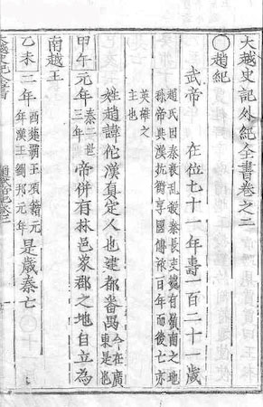 大 越 史 記 外 紀 全 書 卷 之 二 [1a*1*1] Đại Việt Sử Ký Ngoại Kỷ Toàn Thư Quyển Chi Nhị. 趙 紀 [1a*2*1] Triệu KỶ. 武 帝 [1a*3*1] Vũ Đế. 在 位 七 十 一 年 壽 一 百 二 十 歳 [1a*3*3] Tại vị thất thập nhất niên, thọ nhất bách nhị thập nhất tuế. 趙 氏 因 秦 衰 乱 殺 秦 長 吏 㨿 有 領 南 之 地 称 帝 𭁈 漢 抗 衡 享 國 傳 祚 百 年 而 後 亡 亦 英 䧺 之 英 也 [1a*4*1] [Triệu thị, nhân Tần suy loạn, sát Tần trưởng lại, cứ hữu Lĩnh Nam chi địa, xưng đế, dữ Hán kháng hành, hưởng quốc truyền tộ bách niên nhi hậu vong, diệc anh hùng chi chủ dã]. 姓 趙 諱 它 漢 真 定 人 也 建 都 番 禺 今 在 廣 東 是 也 [1a*6*1] Tính Triệu huý Đà, Hán Chân Định nhân dã, kiến đô Phiên Ngung [kim tại Quảng Đông thị dã]. 甲 午 元 年 秦 二 世 三 年 [1a*7*1] Giáp Ngọ, nguyên niên, [Tần Nhị Thế tam niên]. 帝 併 有 林 邑 象 郡 之 地 自 立 爲 南 帝 王 [1a*7*10] Đế tính hữu Lâm Ấp, Tượng Quận chi địa, tự lập vi Nam Đế Vương. 乙 未 二 年 西 楚 覇 王 項 籍 元 年 漢 王 劉 元 年 [1a*9*1] Ất Mùi, nhị niên, [Tây Sở Bá Vương Hạng Tịch nguyên niên, Hán Vương Lưu Bang nguyên niên]. 是 歲 秦 亡 [1a*9*19] Thị tuế Tần vong.