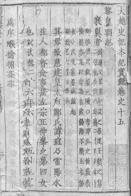 大 越 史 記 本 紀 實 録 卷 之 十 五 [1a*1*1] Đại Việt sử ký bản kỷ thực lục quyển chi thập ngũ. 黎 皇 朝 紀 [1a*2*1] Lê Hoàng Triều KỶ. 襄 翼 帝 [ 諱 瀠 又 諱 晭 聖 宗 之 孫 建 王 鑌 之 弟 二 子 也 在 位 八 年 壽 二 十 四 為 權 臣 鄭 惟 㦃 所 弑 塟 元 陵 慎 罸 亦 足 以 有 爲 也 帝 即 位 之 初 敷 敎 優 游 不 土 木 紛 紜 小 民 失 業 盗 賊 滋 起 馴 𦤶 危 亡 實 由 於 此 [1a*3*1] Tương Dực Đế [Huý Doanh, hựu huý Trừu, Thánh Tông chi tôn, Kiến Vương Tân chi đệ nhị tử dã, tại vị bát niên, thọ nhị thập tứ, vị quyền thần Trịnh Duy Sản sở thí, táng Nguyên Lăng. thận phạt, diệc túc dĩ hữu vi dã. Đế tức vị chi sơ, phu giáo ưu du bất đoán, thổ mộc phân vân, tiểu dân thất nghiệp, đạo tặc tư khởi, thuần trí nguy vong, thực do ư thử ]. 其 母 徽 慈 建 皇 太 后 鄭 氏 諱 瑄 乃 雷 陽 水 注 人 都 督 僉 事 兼 左 崇 正 仲 峯 之 第 四 女 也 以 洪 德 二 十 六 年 六 月 二 十 五 日 生 憲 宗 時 封 简 脩 公 [1a*6*1] Kì mẫu Huy Từ Kiến Hoàng thái hậu Trịnh thị, huý Tuyên, nãi Lôi Dương Thuỷ Chú nhân, Đô đốc thiêm sự kiêm Tả sùng chính Trọng Phong chi đệ tứ nữ dã, dĩ Hồng Đức nhị thập lục niên, lục nguyệt, nhị thập ngũ nhật, sinh Hiến Tông, thời phong Giản Tu công. 及 威 穆 帝 誅 戮 宗 室 乃 挺 [1a*9*7] Cập Uy mục Đế tru lục tông thất, nãi đĩnh..