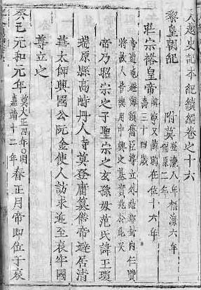 大 越 史 記 本 紀 續 編 卷 之 十 六 黎 皇 朝 紀 附 莫 登 瀛 八 年 福 海 六 年 福 原 二 年 莊 宗 裕 皇 帝 諱 寧 又 諱 㫬 在 位 十 六 年 壽 三 十 四 歲 帝 遭 屯 避 難 頼 舊 臣 尊 立 外 結 鄰 封 内 任 贒 将 故 人 皆 樂 用 中 興 之 基 實 兆 於 此 矣 帝 乃 昭 宗 之 子 聖 宗 之 玄 孫 [1a*1*1] Đại Việt Sử Ký Bản Kỷ Tục Biên quyển chi thập lục. Lê Hoàng Triều KỶ. Phụ Mạc [Đăng Doanh bát niên Phúc Hải lục niên Phúc Nguyên nhị niên,] Trang Tông Dụ Hoàng Đế [Huý Ninh, hựu huý Huyến Tại vị thập lục niên, thọ tam thập tứ tuế.] [Đế tao đốn tị nạn, lại cựu thần tôn lập, ngoại kết lân phong nội nhiệm hiền tướng, cố, nhân giai lạc dụng, trung hưng chi cơ thực triệu ư thử hĩ] Đế nãi Chiêu Tông chi tử, Thánh Tông chi huyền tôn. 母 范 氏 諱 玉 瓊 瑞 原 縣 髙 峙 𱏺 人 [1a*5*12] Mẫu Phạm thị, huý Ngọc Quỳnh Thuỵ Nguyên huyện Cao Trĩ sách nhân. 時 莫 登 庸 簒 僣 帝 避 居 清 華 [1a*6*8] Thời, Mạc Đăng Dung soán tiếm, Đế tị cư Thanh Hoa. 太 師 興 國 公 阮 金 使 人 訪 求 迎 至 哀 牢 國 尊 立 之 [1a*7*2] Thái sư Hưng quốc công Nguyễn Kim sử nhân phỏng cầu nghênh chí Ai Lao quốc tôn lập chi. 癸 巳 元 和 元 年 莫 大 正 四 年 〇 [1a*9*1] Quý Tị Nguyên Hoà nguyên niên, [Mạc Đại Chính tứ niên . 明 嘉 靖 十 二 年 春 正 月 帝 即 位 于 哀 … [1a*9*13] Minh Gia Tĩnh thập nhị niên,] xuân chính nguyệt, Đế tức vị vu Ai..