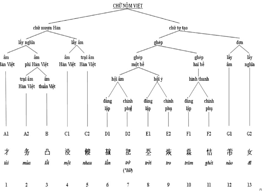 Thuyết minh sơ đồ: 1. Đây là sơ đồ tổng quát về các loại cấu trúc chữ Nôm, được xác lập trong sách Khái luận văn tự học Chữ Nôm (Nguyễn Quang Hồng, Nxb Giáo dục, 2008). Khi áp dụng cho tự điển Chữ Nôm dẫn giải, chúng tôi có điều chỉnh đôi chút đối với loại G (Chữ Nôm đơn tự tạo): G1 và G2 đều là do mượn chữ Hán (cá biệt là chữ Nôm có trước) cải biến mà thành, nhưng G1 là cải biến bớt nét, còn G2 là cải biến thêm nét. Ở đây sẽ không phân biệt theo tiêu chí “lấy âm” hay “lấy nghĩa”, mặc dù nếu tiếp tục phân tích, thì mỗi loại G1 và G2 đều có thể lưỡng phân theo tiêu chí âm - nghĩa này. 2. Trong tự đi ển này, những chữ Nôm mang “dấu cá” (个) hoặc “dấu nháy” (‹) cũng được xếp vào loại G2. Như vậy dung lượng và phạm vi các chữ Nôm đơn tự tạo (còn gọi là chữ Nôm “đặc chế”) có phần nhiều hơn và rộng hơn so với sự hình dung trước đây. Chữ Nôm mang “dấu nháy” có khi bắt gặp trong các văn bản khắc in, song chủ yếu được dùng trong các văn bản viết tay và có phần tùy tiện. Trong tự điển này chỉ thu nạp một số chữ mang “dấu nháy” làm đại diện mà thôi. 3. Loại chữ A2, là những chữ vay mượn chữ Hán lấy cả âm và nghĩa mà không đọc theo âm Hán Việt, nếu phân tích kĩ về mặt âm đọc, có thể phân biệt hai nhóm: Nhóm (a) gồm những chữ đọc theo âm “Tiền Hán Việt”, tức là âm đọc của chữ Hán ấy còn bảo lưu âm cổ Hán ngữ từ lâu trước thời Đường Tống (như: 務 mùa, 燭 đuốc …), và nhóm (b) là gồm những chữ (như: 嘆 than, 禍 vạ, …) mà âm đọc có được từ sau khi hình thành âm Hán Việt và tiếp tục Việt hóa từ âm Hán Việt (và đôi khi cả từ âm “Tiền Hán Việt”) mà ra, tức là âm “Hậu Hán Việt”. 4. Khi phân tích các chữ Nôm ghép tự tạo, gồm các loại “hội âm” “hội ý” “hình thanh” thì mô hình phân loại cấu trúc này không chỉ áp dụng cho các chữ Nôm có thành tố biểu âm và biểu ý đều là chữ Hán, mà cũng áp dụng cho cả những chữ Nôm trong đó có thành tố biểu âm hay biểu ý là chữ Nôm có trước. Đối với chữ Nôm là chữ mượn dùng một chữ Nôm đồng âm hoặc gần âm (mà khác nghĩa), thì dùng thuật ngữ “chuyển dụng” trước khi giải nghĩa chữ này trong các câu dẫn, còn cấu trúc của nó thì “trả về” cho chữ Nôm mà nó mượn dùng. |